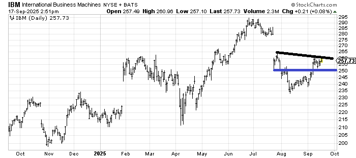 Part of me is tempted to see the pattern IBM IBM has developed since late July as a head and shoulders bottom with a target of filling that gap above. The other part of me wonders if this is the right shoulder of a much larger head and shoulders top, with the left shoulder over there in February. If IBM cracks under 250, I would think the former view is wrong.