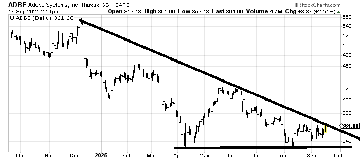 Every single time I think Adobe ADBE is bottoming, along comes an earnings report that gaps it down. With that caveat in place, if it can get over this 365-ish area, which would clear the last month’s highs and the downtrend line, it would greatly improve the chart that really does appear to be bottoming. One final note: any stock sitting near its lows in September, as we head into the fourth quarter, is a candidate for tax loss selling.