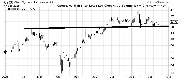 There is someone who inquires about Cisco CSCO quite frequently, and for the last few months, I have been lukewarm. I want to note that the stock has corrected by going sideways, so as long as it holds 66, I’d be okay with dipping a toe back in.