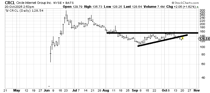 I recommended Circle Internet (CRCL) back in September near the low and it had a nice run. I keep trying to search for another time to buy it for a trade, but so far I can’t seem to find the right time or pattern. I don’t like that it broke that uptrend line. I’ll say this: If it can go sideways for a bit longer (a week or so) then I might feel more confident that the $120 area wants to hold and is solid enough to buy. A break of $120 would not be good.