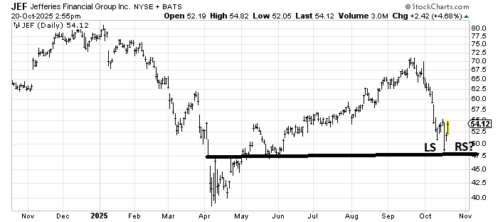 It would be teeny tiny, but if Jefferies (JEF) can come back toward that $52 area it would look like the right shoulder of a head-and-shoulders bottom.
