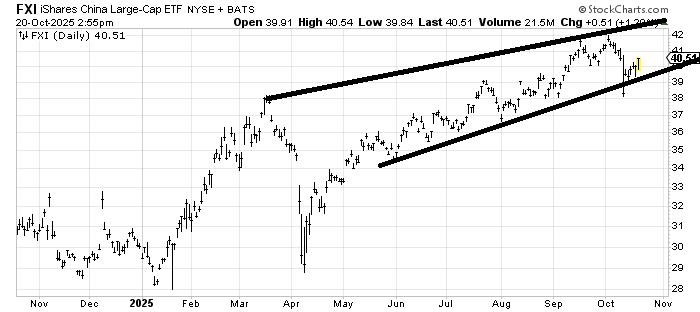 I do not have a strong view on iShares China Large-Cap (FXI) , an ETF to be long China stocks, right now. It’s in a funky channel, but I’m just not certain it’s going straight back to the top of the channel. As you might know I have now warmed up to Indian stocks (INDA) where a few months ago I liked the Chinese stocks. Group rotation is still alive.