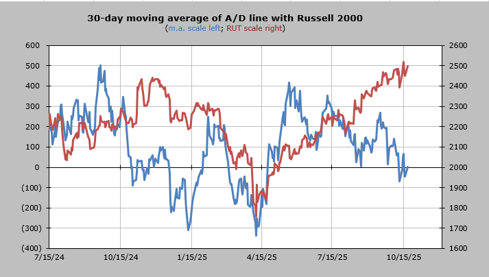 The 30-day moving average of the advance/decline line is not yet fully oversold.
