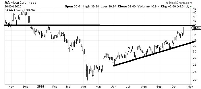I have been asked if I have a target on Alcoa (AA) . I do not. I view this chart similarly to the (XBI) chart we looked at months ago. There is a lot of resistance to eat through so dips that stay over that uptrend line are good. The next big resistance is coming up around $40.