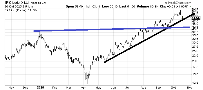 IperionX (IPX) hasn’t done anything wrong yet (breaking the line would be a first step toward doing something wrong). The stock has reached a measured target so now I would want it to have a proper correction and set up a pattern again. Breaking that uptrend line isn’t dire, but I think it would mean a much deeper correction or a more prolonged sideways one.