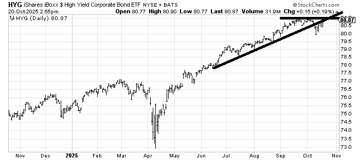 iShares iBoxx $ High Yield Corporate Bond (HYG) , an ETF to be long high-yield bonds, broke the line and rebounded so it probably gets stuck near resistance (low $80s) on this trip back up. Again, I will sound like a broken record, but I prefer a pattern to shape up.