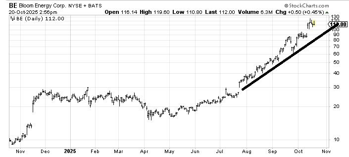 Bloom Energy (BE) is a parabolic stock so I will never like it up here. It has met its upside measured target. A pullback to the line would be good. A gap down under $100 would be bearish as it would leave the last week or so as an island overhead.
