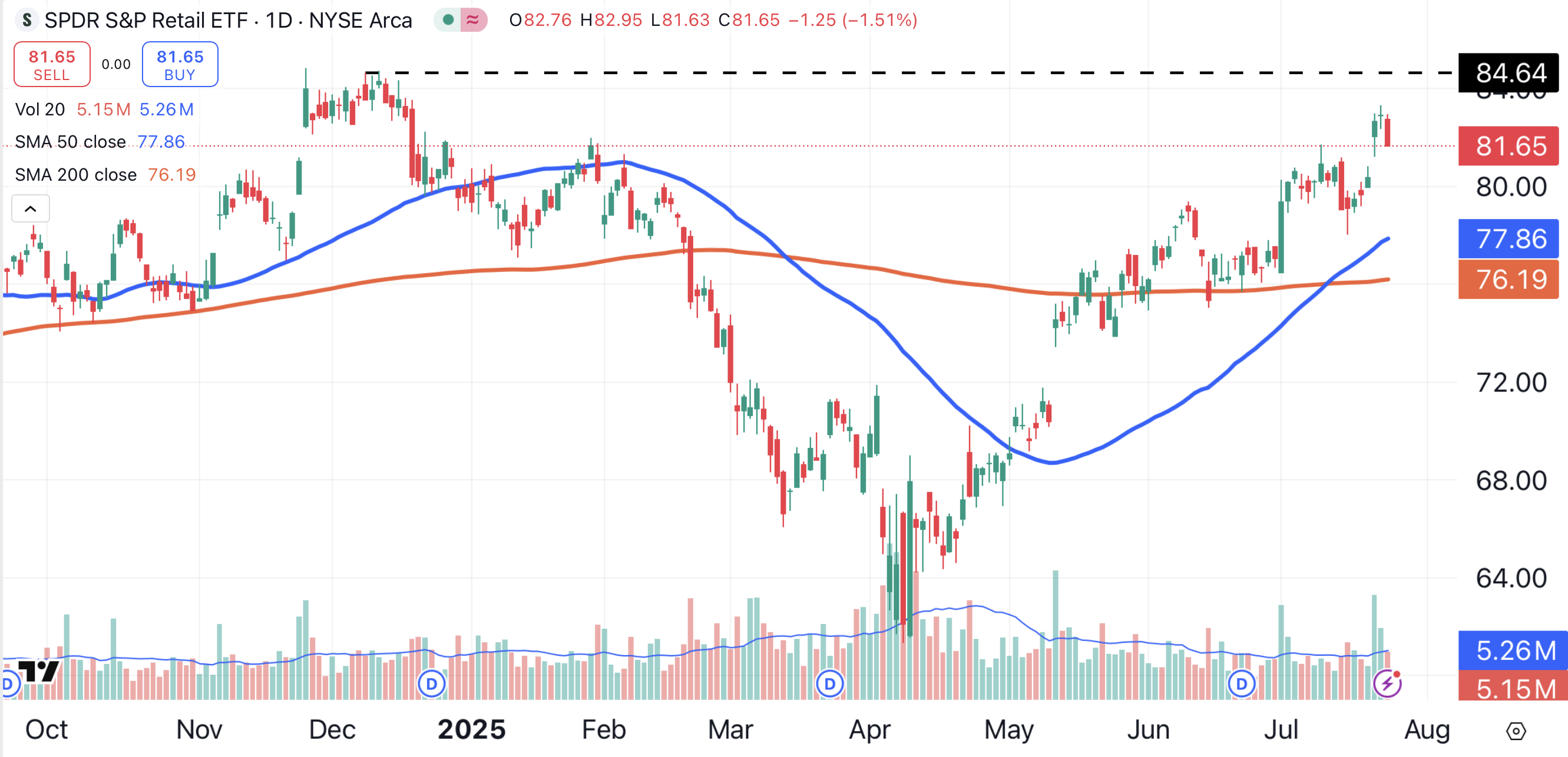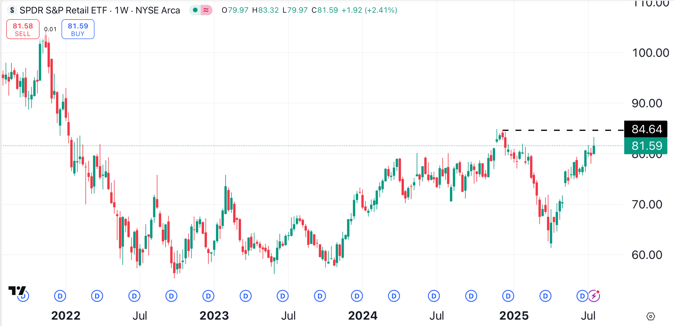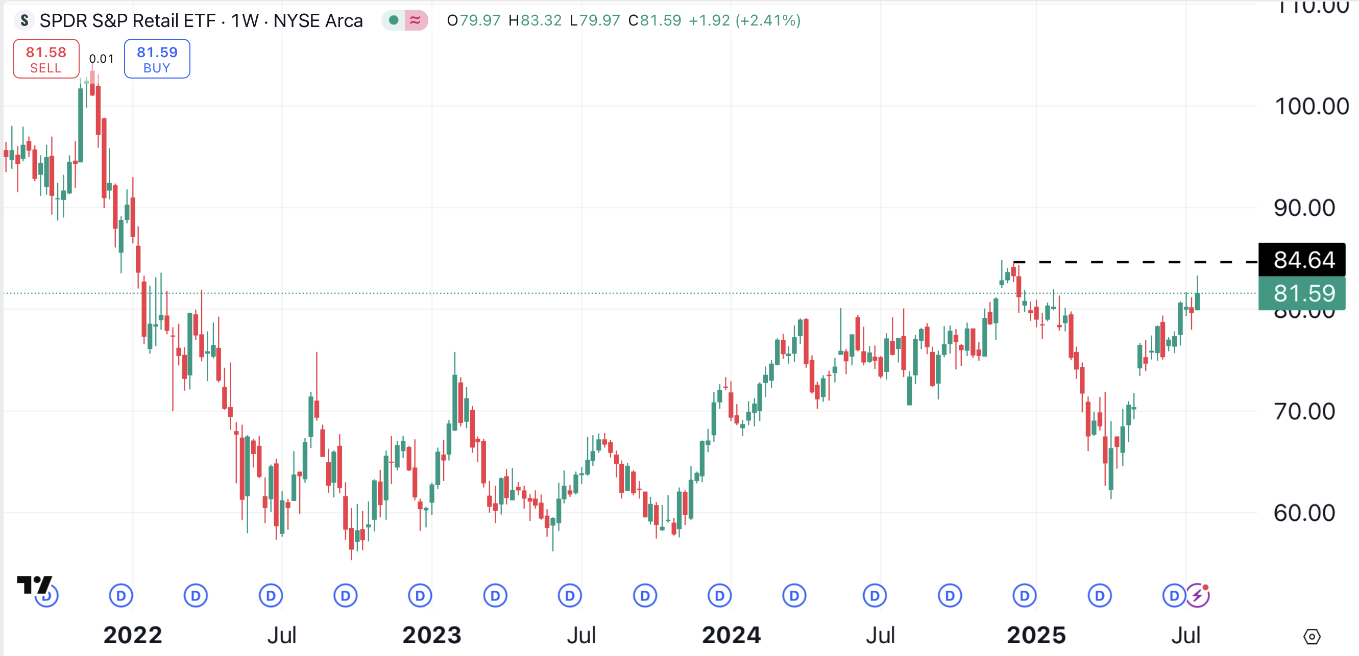 The S&P Retail ETF has performed well lately, gaining about 33% since early April. But it’s about to encounter resistance in the area just above $84.50 (black dotted line), which could limit further gains.