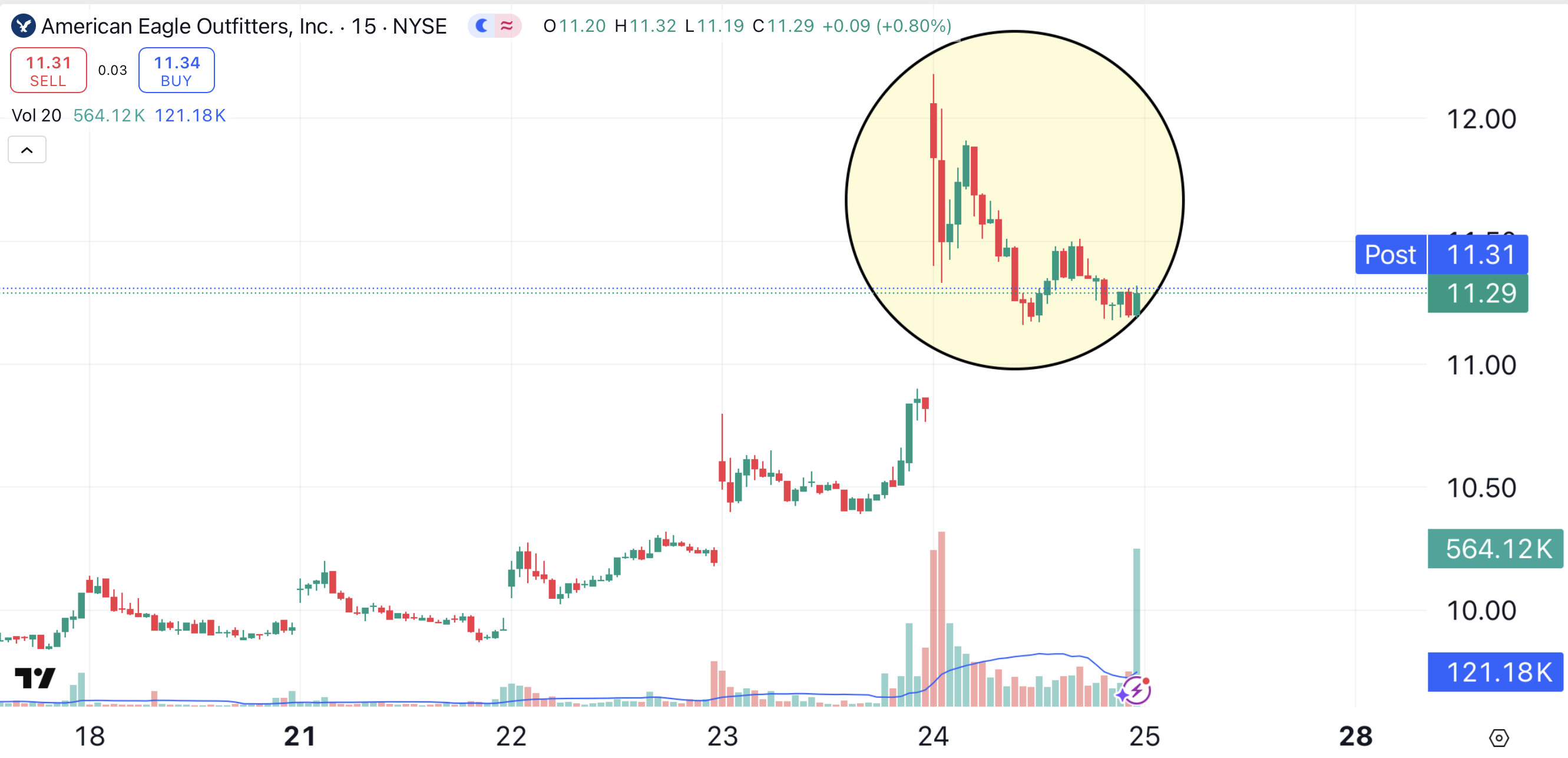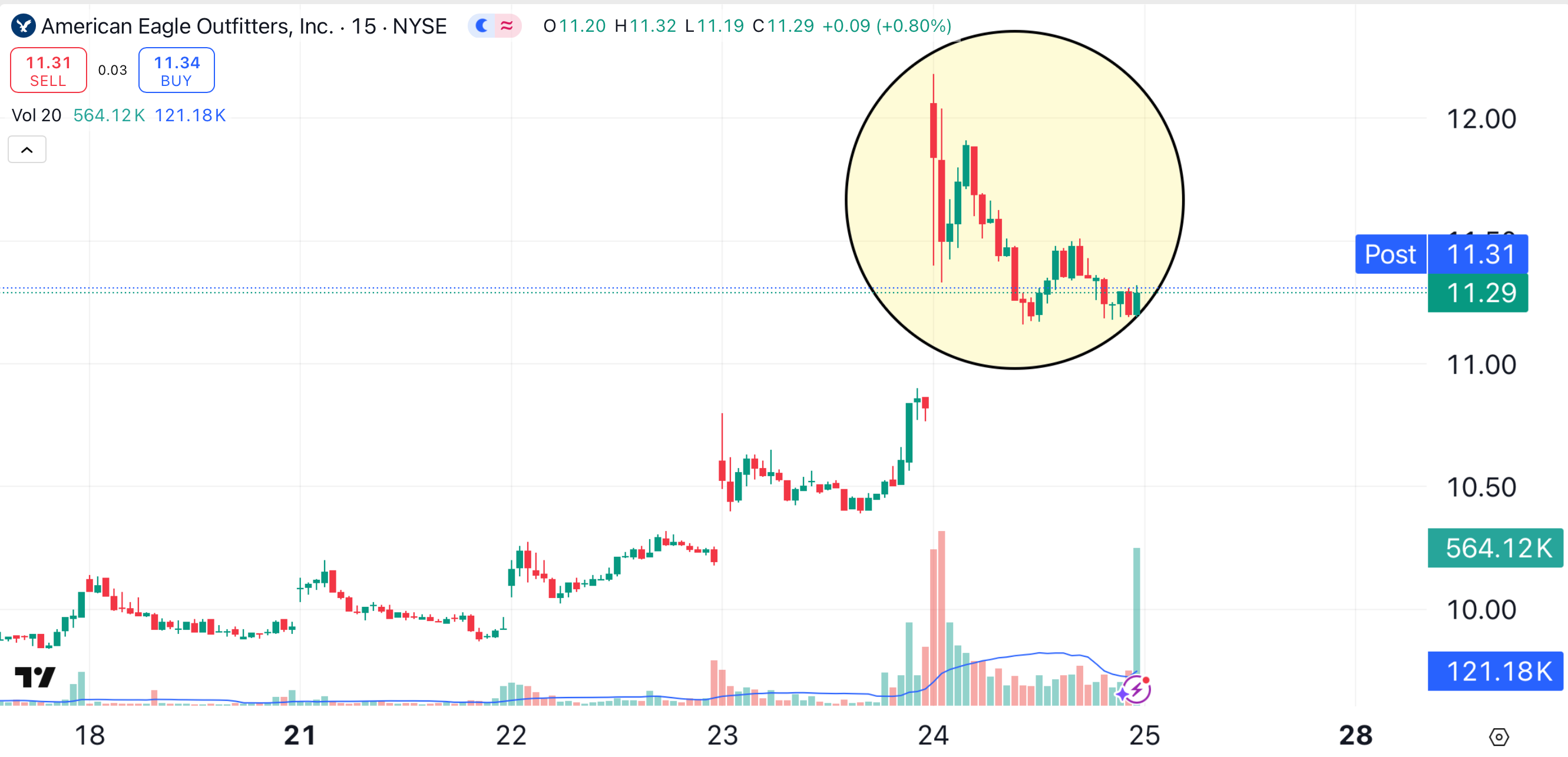 This is demonstrated on AEO’s 15-minute chart (shaded yellow):