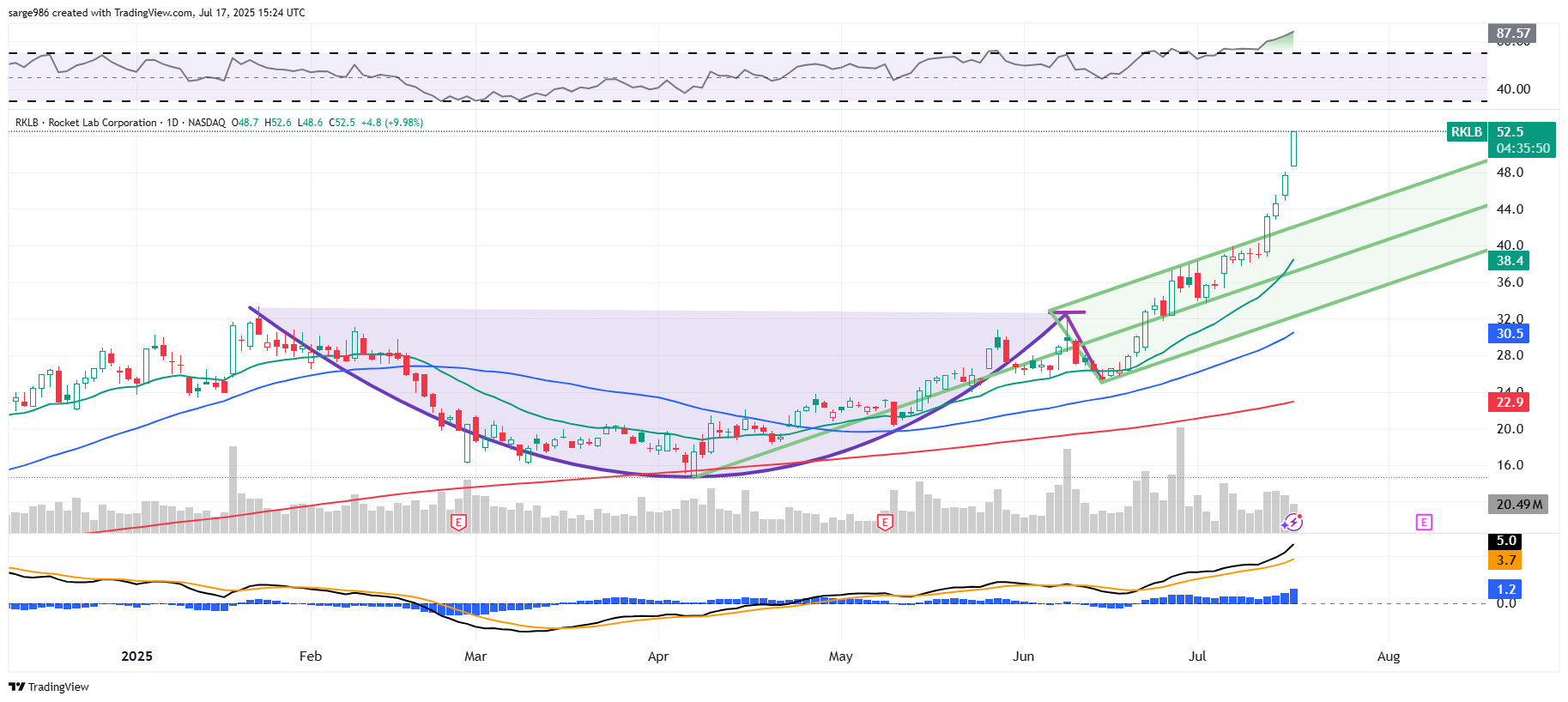 ​Readers will see the breakout from the cup-and-handle pattern and the breakout from the Andrews' pitchfork model literally piled on top of one another. We had given readers the upper trendline of the Pitchfork model as our pivot. Now, there is no pattern, there is no pivot. We have a stock that has gone parabolic on our hands. Rocket Lab does not report until August 7. Hopefully we do not have to wait that long to hear from CEO Sir Peter Beck.