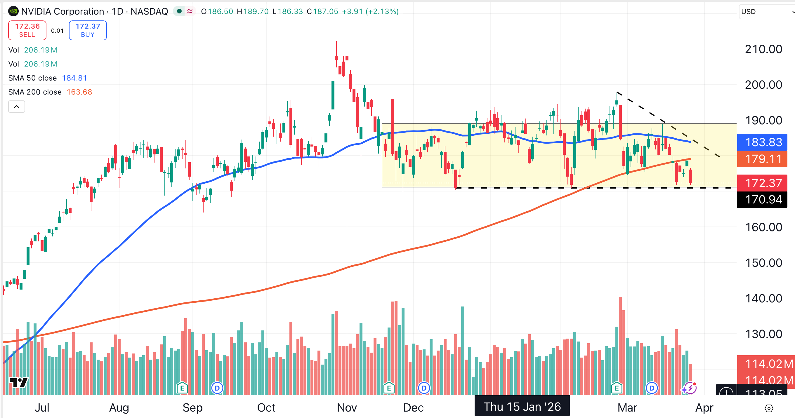 Nvidia (NVDA) has slipped below its 200-day MA (red), but remains within a sideways range (shaded yellow). Unfortunately, Nvidia is near the bottom of that range, which ends at approximately $170.