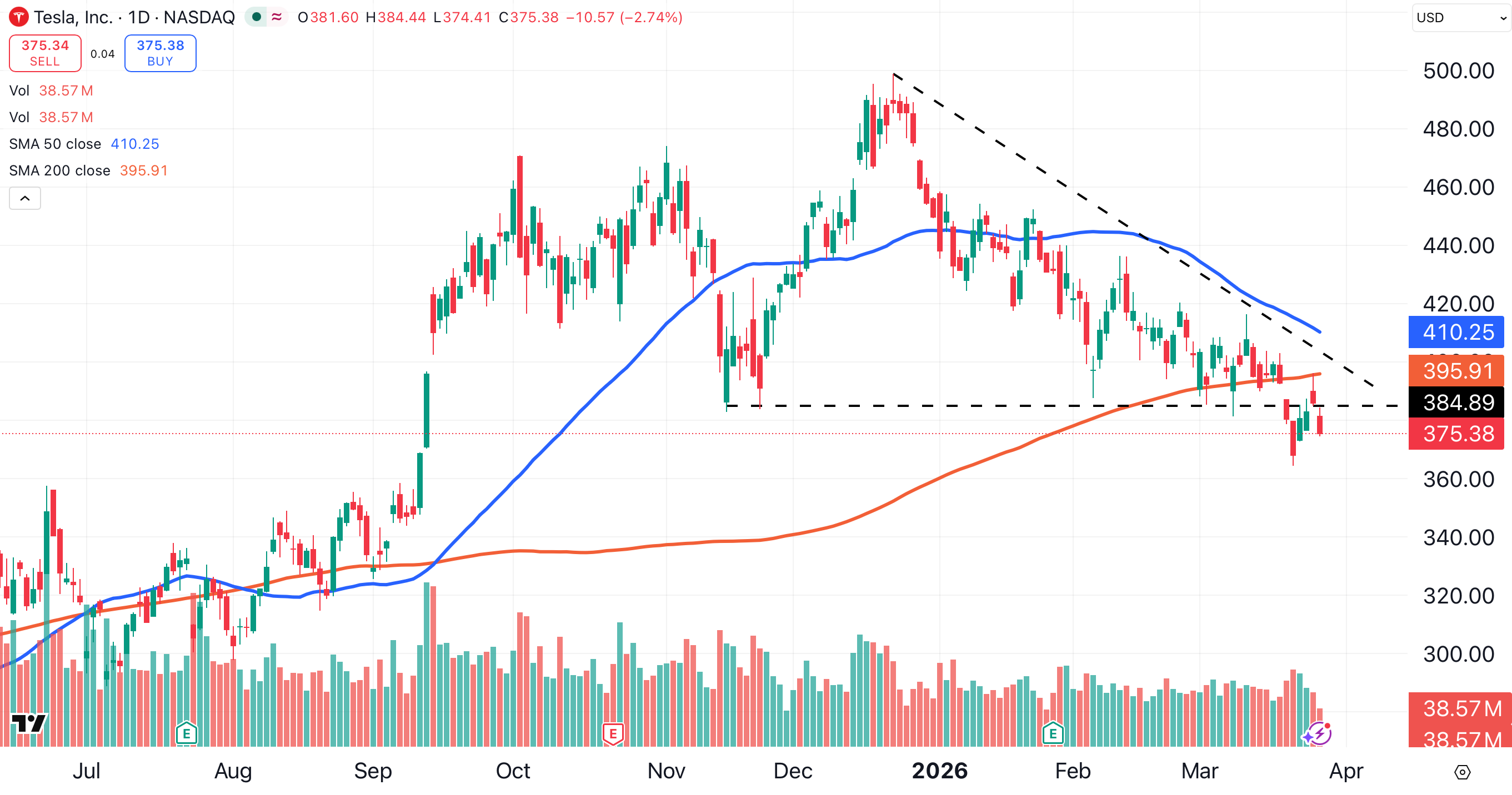 Tesla is still at a point where a decent bounce could place it back above resistance at $385, and above its 200-day MA at $395.
