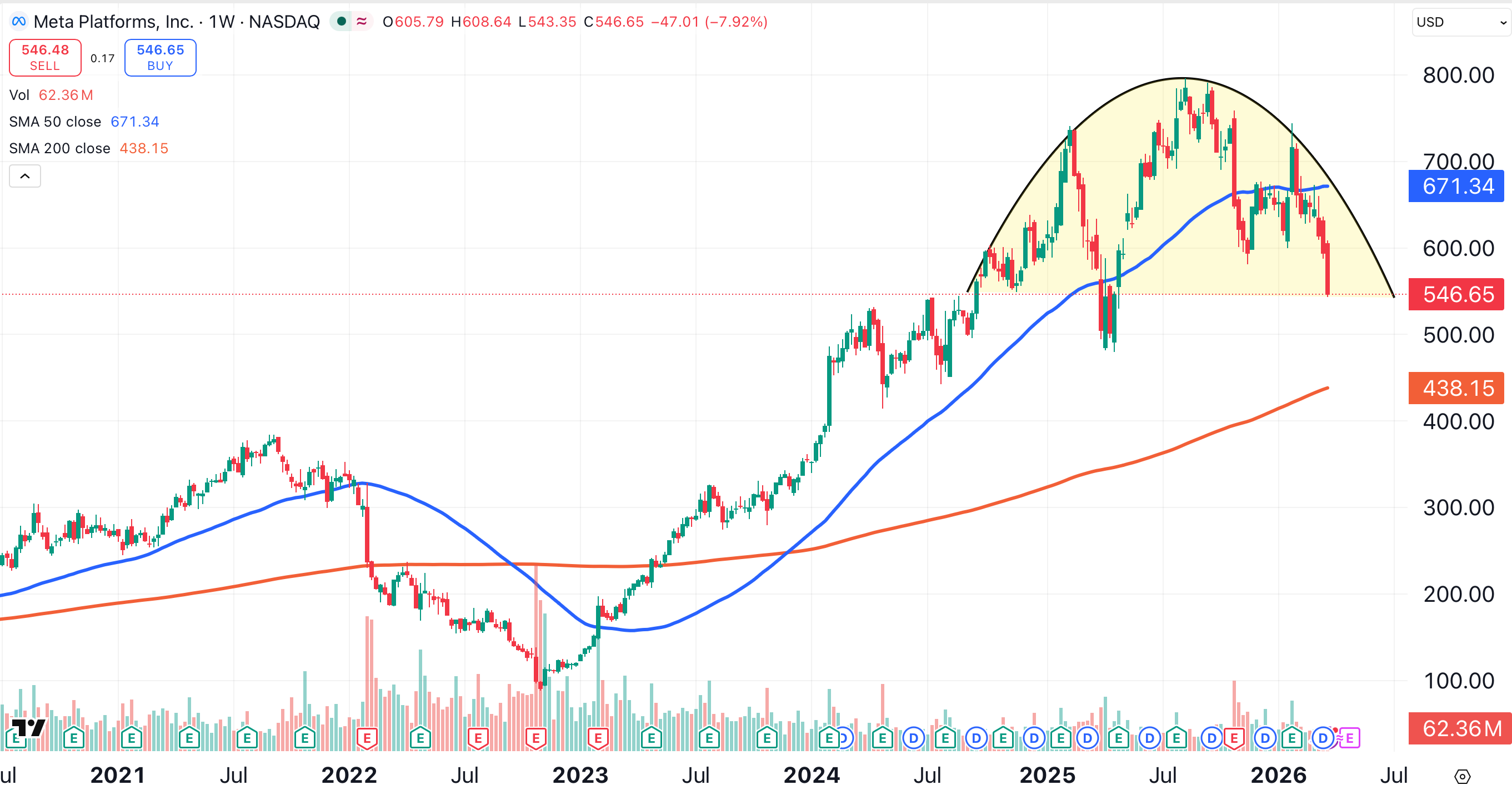 Zooming out to the weekly chart, Meta has formed a large topping pattern over the past 18 months (shaded yellow).
