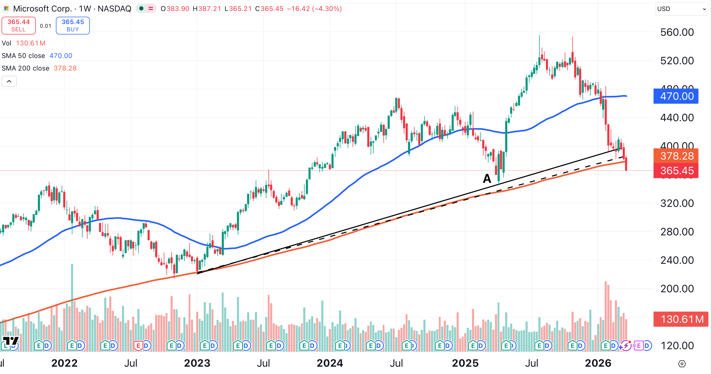 Microsoft is the only Mag 7 stock to fall below its 200-week moving average. The stock could find support near $344, a major low point from April of last year (point A).