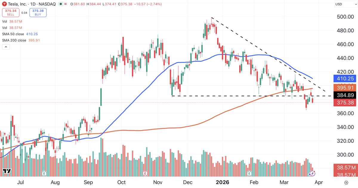 Despite breaking support and falling below its 200-day MA, Tesla (TSLA) is also hanging tough. The EV and robotics company is holding firm just below resistance of $385.