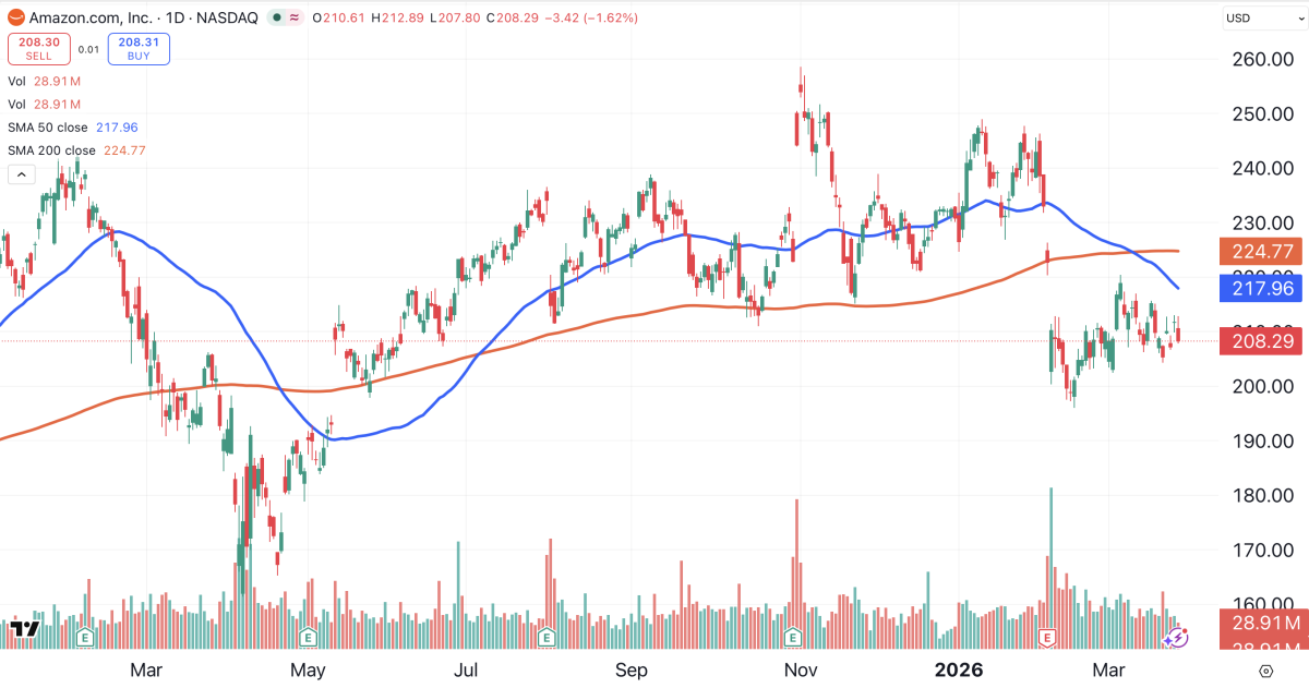 Amazon (AMZN) is in a similar position, consolidating just below support, and not far below its key moving averages.