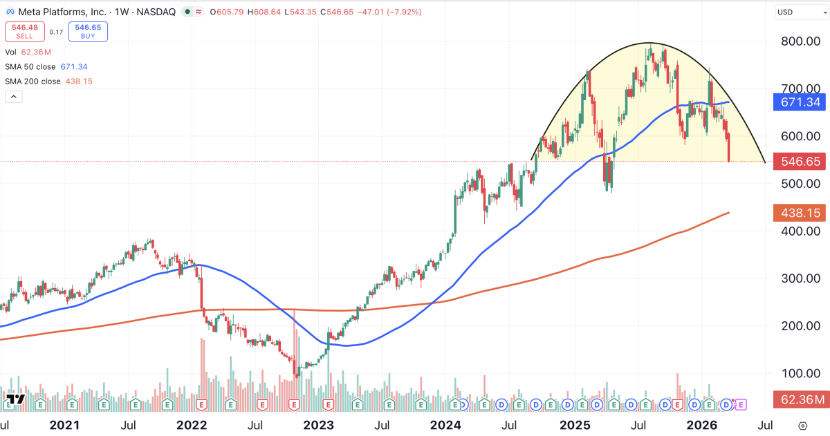 Since this is a weekly chart, Meta is trading below its 50-week moving average (blue), which is considered similar to a 200-day MA.