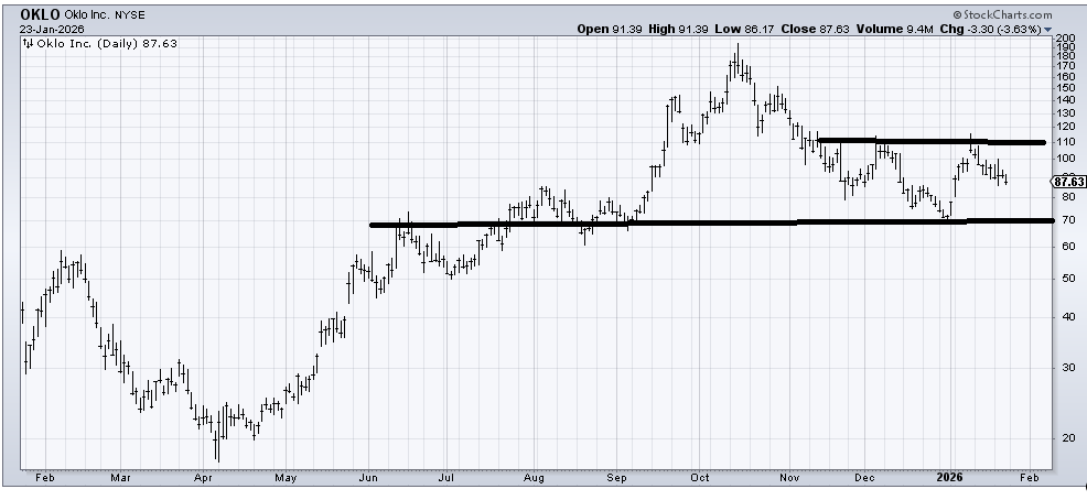 Instinctively, I look at Oklo (OKLO) and want to think it is forming a small head and shoulders bottom now (right shoulder would be at 80-ish), but I am also aware that many of these charts that peaked in October have only enjoyed short-term rallies before heading down again. For now, I’d say near 80, I’m a buyer for a trade, and then let’s see if that works and how it works.
