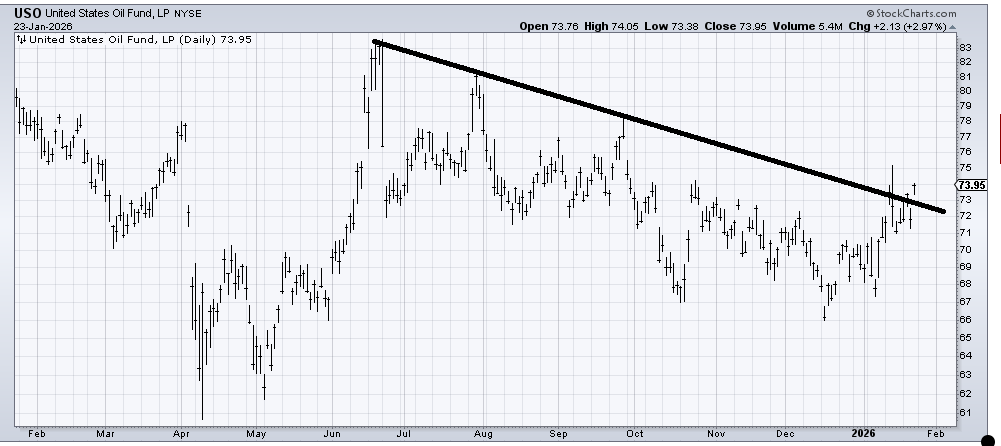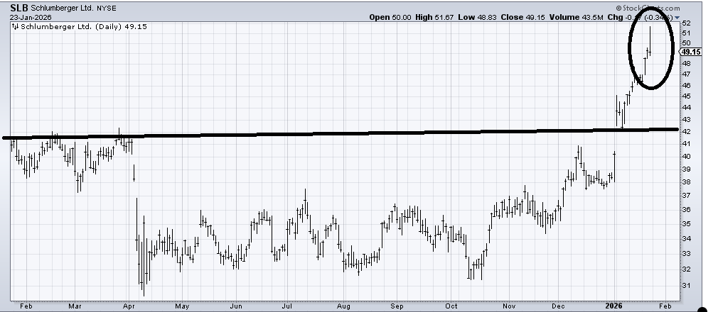 (USO) , an ETF to be long oil, is trying to build a base, but there is so much resistance all the way up, I can’t come up with any targets. All we can do is watch the DSI, which is currently 70. What I would point out is that OIH looks overcooked up here and is in need of a pullback. That includes a stock I have liked for a long time: Schlumberger (SLB) . SLB has tagged its target at 51. Taking something off the table there is encouraged.