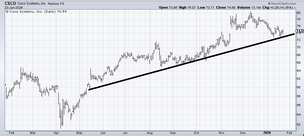 We looked at Cisco (CSCO) a few weeks ago when it filled that gap, and I thought it would bounce. I like the way it tested that low and bounced as well as bouncing off that uptrend line. It probably takes some time, but the pullback looks okay to me. I would prefer it doesn’t crack under 72, though.