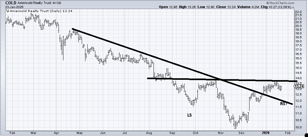 Americold Realty (COLD) has a great ticker symbol and also appears to be trying to develop the right shoulder of a head and shoulders bottom. Getting over the neckline at 13.75 isn’t a great breakout since you can see the layers of resistance all the way up, but it would sure improve the chart. Of course, I love symmetry and would love to see a quick trip to test the downtrend line around 12 first.