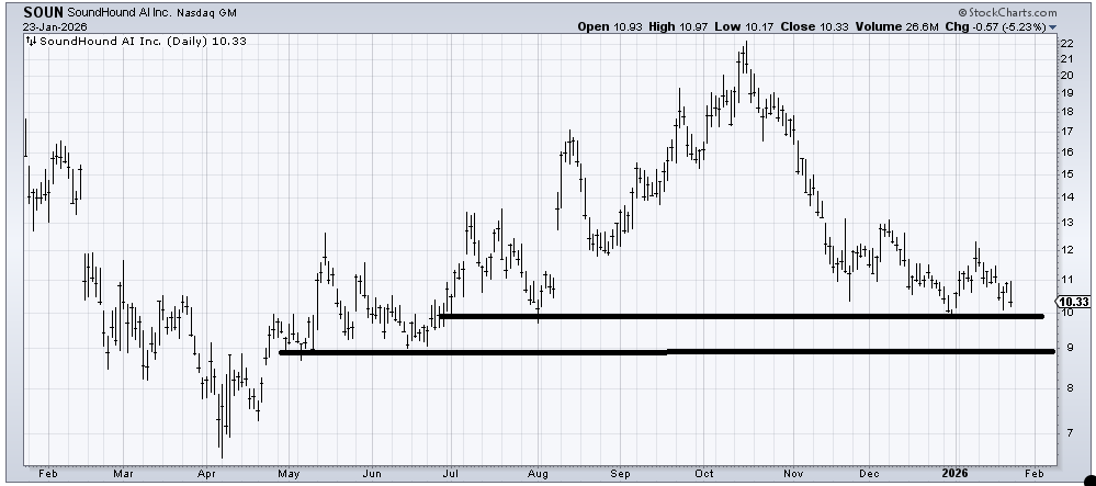 Soundhound (SOUN) has layers of support all the way down. It broke support at 11 and rallied. If it breaks support at 10, now you can see there is support at 9. Then a gap fill just over 8, etc. If you want to buy it, it’s hard to say use a stop under 10 for that reason, but what you want to see is when the stock does rally again, can it get over that early January high, just over 12. Because it hasn’t managed to make a higher high since October. If it is still holding 10 as we get back to an oversold condition, then maybe it looks more like a base.