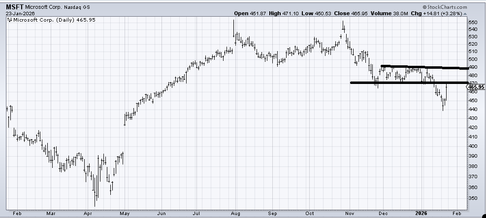 We got lucky with a trade in Microsoft (MSFT) as it rallied well on Friday. It is now pushing up against resistance, and earnings are due out Wednesday. Unless the stock gaps up over that 500 area, I suspect it runs out of gas short-term in this resistance zone.