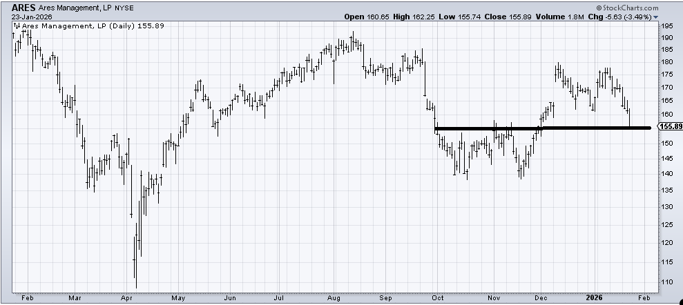 Then there are the asset managers, which have quietly started breaking down again. You might recall I highlighted this group back in September when they started falling apart. Ares Management (ARES) is just one name in the group, and you can see on Friday it fell out of a support it had been holding for the last two months. Now it has another layer here at 155. But that is not great action.