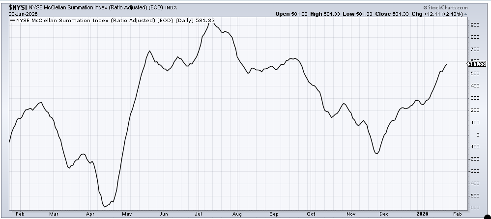 In fact, breadth held up rather well considering. The McClellan Summation Index is very much in focus now, though, because it will take a mere net negative of -500 advancers minus decliners to stop the rise in the Summation Index. That is not much of a cushion.