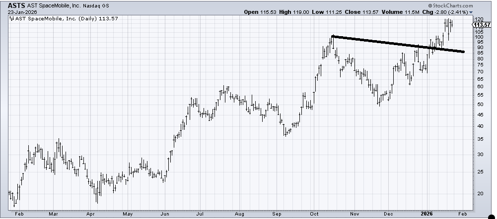 AST Spacemobile (ASTS) hasn’t done anything wrong, but it is not my kind of chart to chase. I’m not sure it pulls back to support (90-100), but if it does, it would look okay to me; otherwise, I would call it a hold. There is a short-term target around 125-ish and another one at 140.