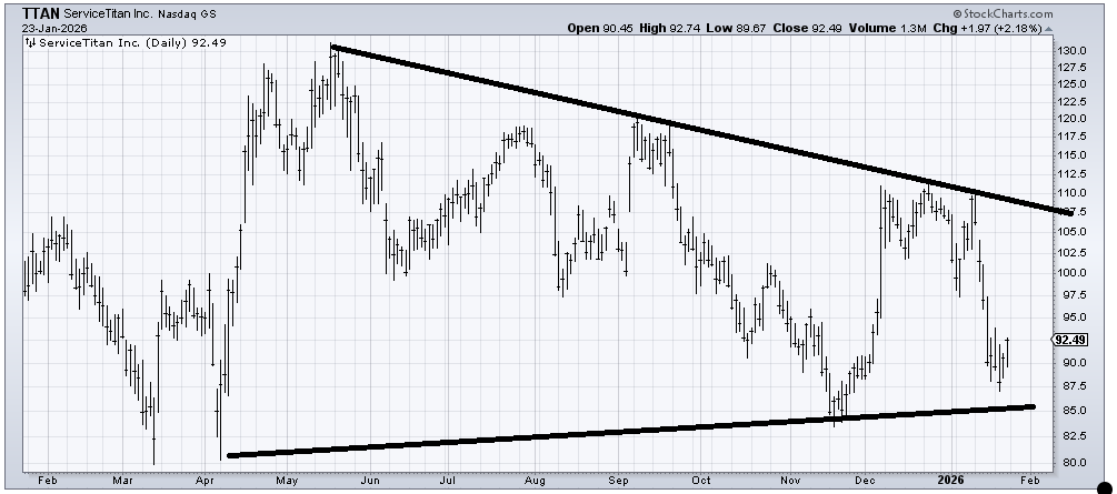 Service Titan (TTAN) held support and is trying to enjoy an oversold rally. Right now, it appears to me that this is just an oversold rally. However, I can see the chart developing over time (a few months) to build a base. So as long as that lower line stays intact, I would keep an eye on this each time it comes down to this area.