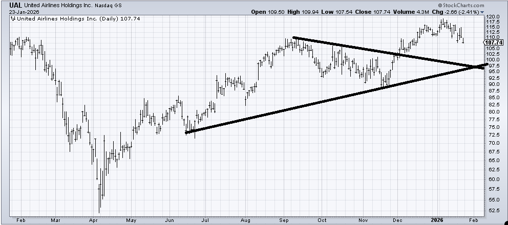 United Air (UAL) , like the Transports, can use a solid correction. There is support all the way down, so it’s hard to say the exact level it is going to, but if it gets to that 95-100 area again, I’d say it would be time to have another look at it.