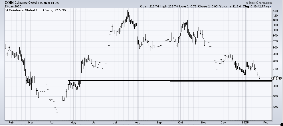 Last time we checked in on Coinbase (COIN) , I thought it would bounce off 240. It did. But I did not expect it to break 240 so handily on the next trip back down. There is a gap fill just below (I’m using a range of 212-215), and it is getting oversold, but that’s the best I can say about it.