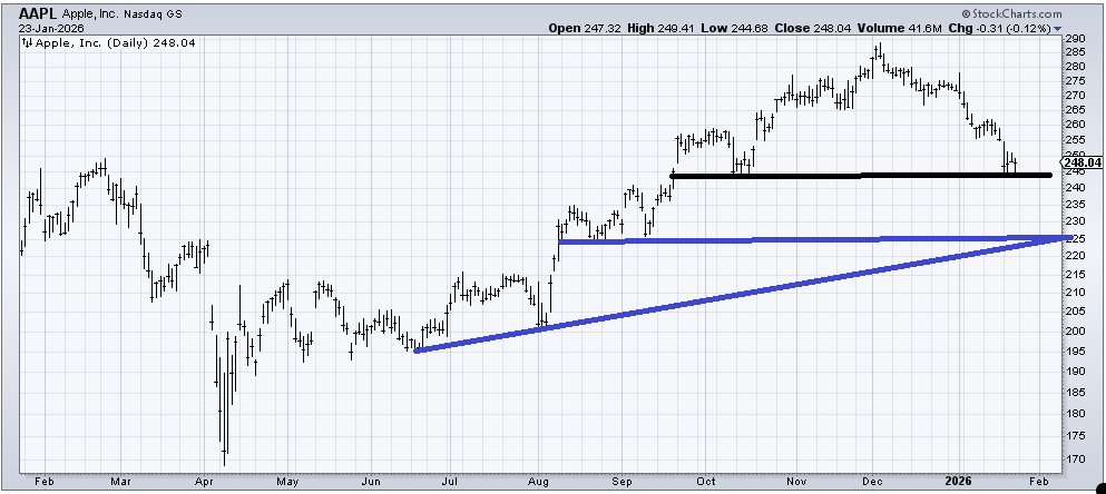 It has good support at 245 (black line). Maybe it bounces from here. But you see those blue lines and how they intersect right around 225? I think if AAPL somehow finds its way down there, I’d consider it grossly oversold and at support. Also, if AAPL did make it to that area, I can only imagine how the negative chatter would be deafening. And that would be enough for a decent bounce.