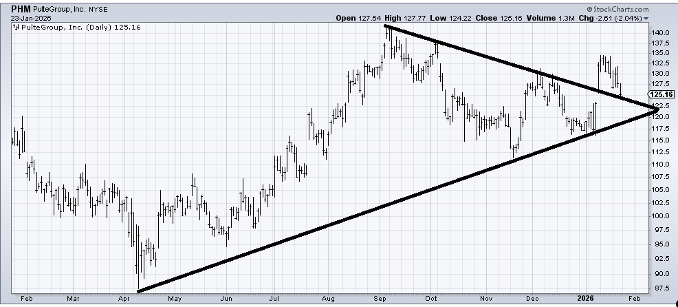 Finally, a few weeks ago, I recommended Pulte (PHM) , and we had a terrific pop in it. I thought the leakage was normal after such a pop, but I did not like Friday’s action. It ought to rally again after filling that gap around 123, but I fear the chatter now will be the weather across the US is holding back the homies.