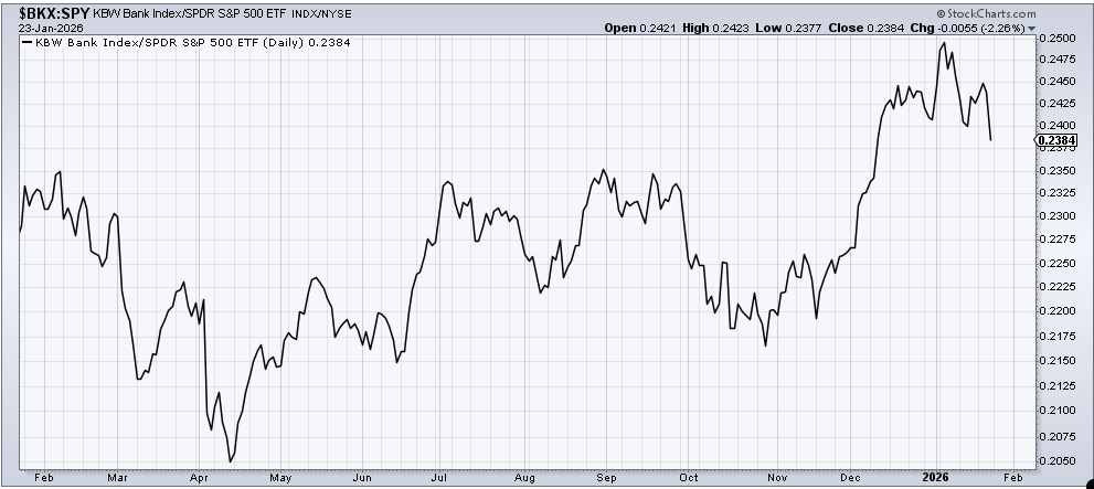 One reason I think it is worth fussing over is that I do believe the banks are over-owned, but also when we look at the ratio of the Bank Index relative to the S&P, we see it has in fact broken ‘the line’ and that banks have been underperforming since the calendar turned to 2026.
