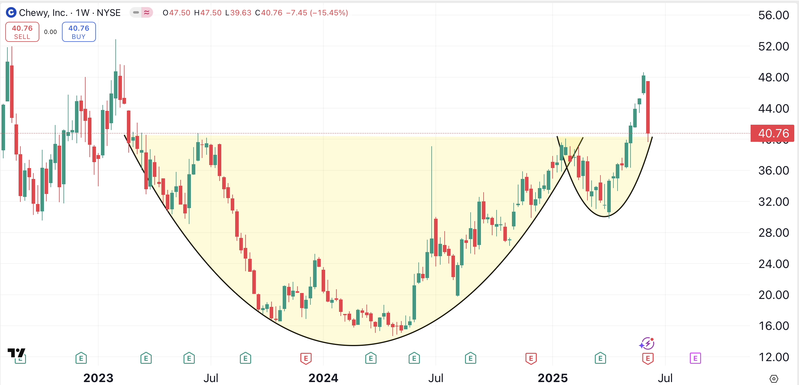 Looking at Chewy’s weekly chart, a huge cup-and-handle pattern has formed. Wednesday’s sharp pullback places the stock right back to the breakout point of this formation. This pattern suggests that Chewy could climb as high as $65 — a potential gain of nearly 60% from Wednesday’s close.