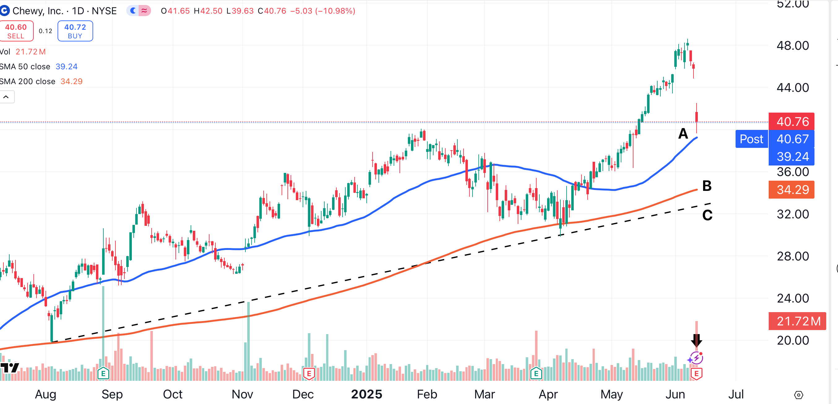 Chewy rolled over on heavy volume, when will it be safe to buy the stock?