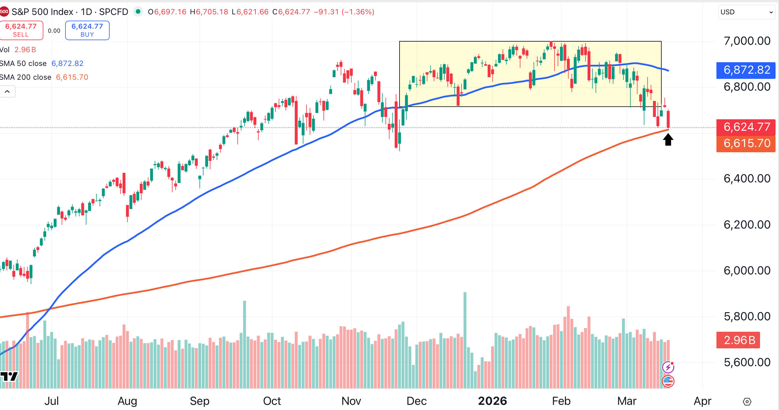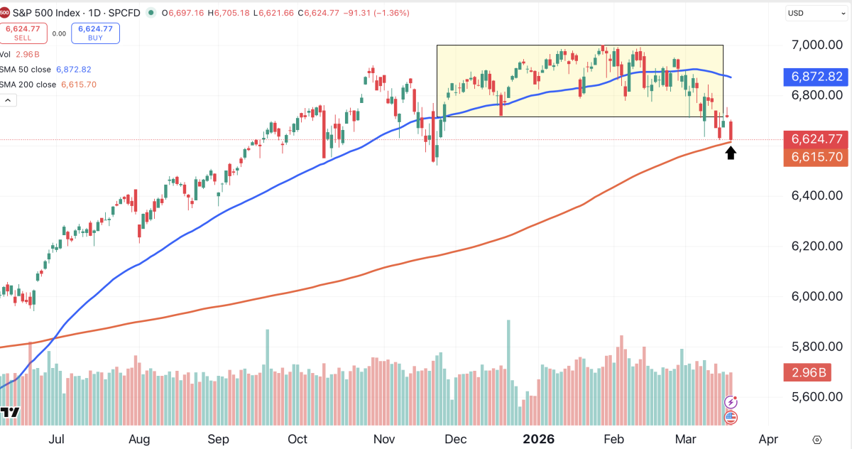 The S&P 500, hammered by Powell’s comments, has fallen out of its trading range (shaded yellow) to close at its lowest level in nearly four months. The large-cap index closed about 10 points above its 200-day moving average (red).