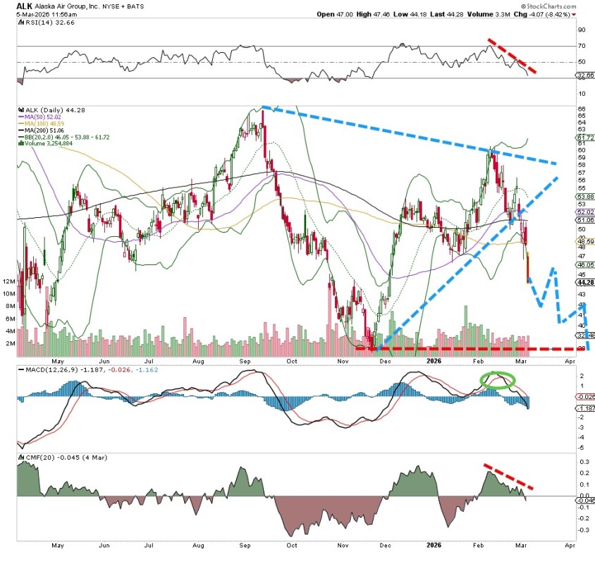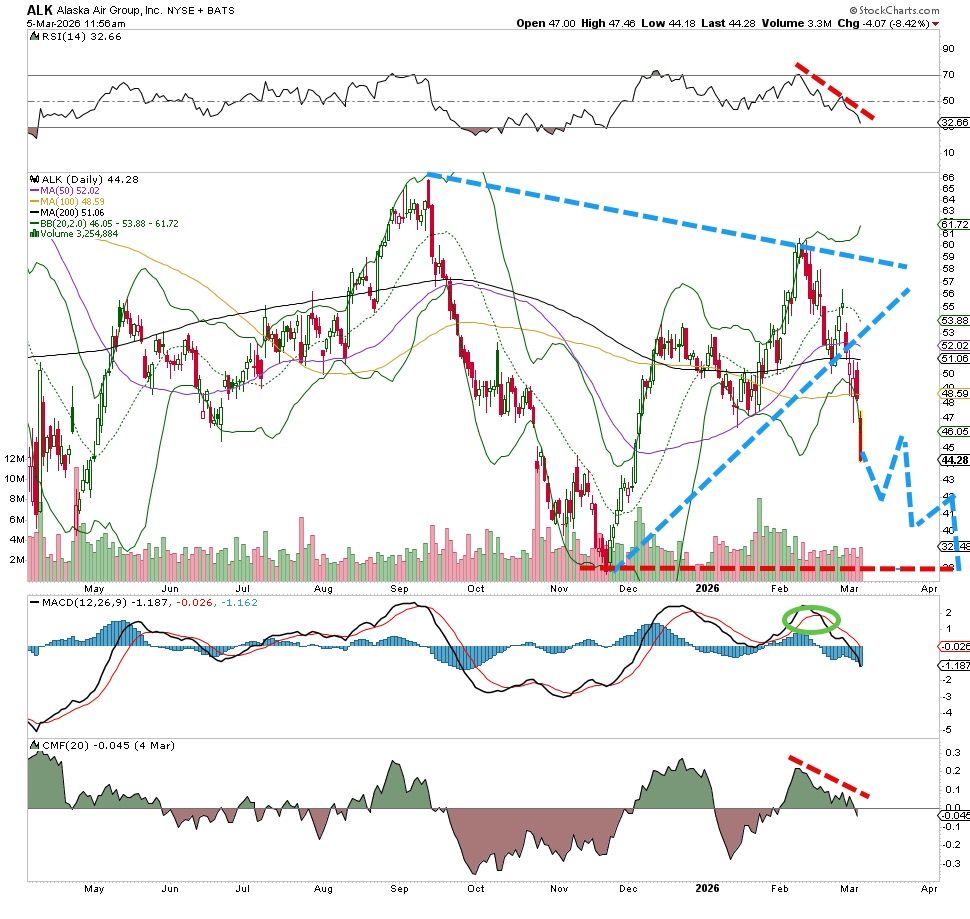 It has been a rough couple of weeks for one of the bigger airline carriers Alaska Air (AAL) , but the bears have taken control of the stock. Right near the lows in November, this stock has taken on a lot of water recently and may continue to falter if global news (Iran, oil) does not improve.
