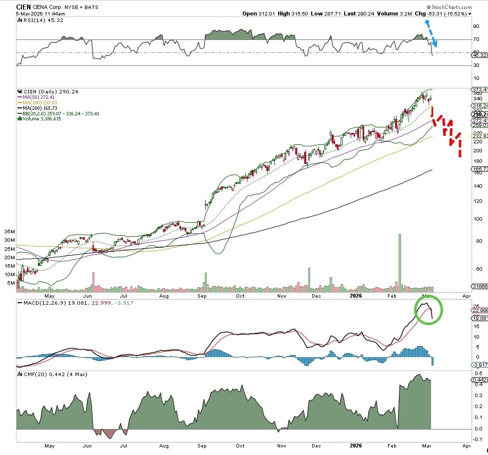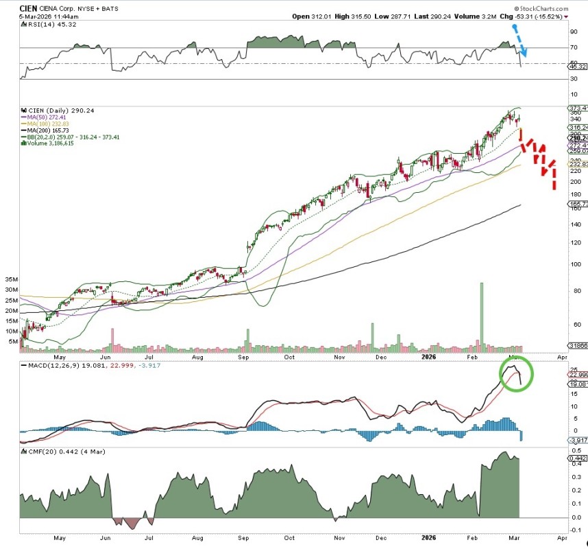 What an amazing run Ciena (CIEN) has been on over the past year. From the $40s, we saw this company reach a peak this month at $374, nearly a 1,000% gain during that time. An incredible move but now much of it may soon be challenged.