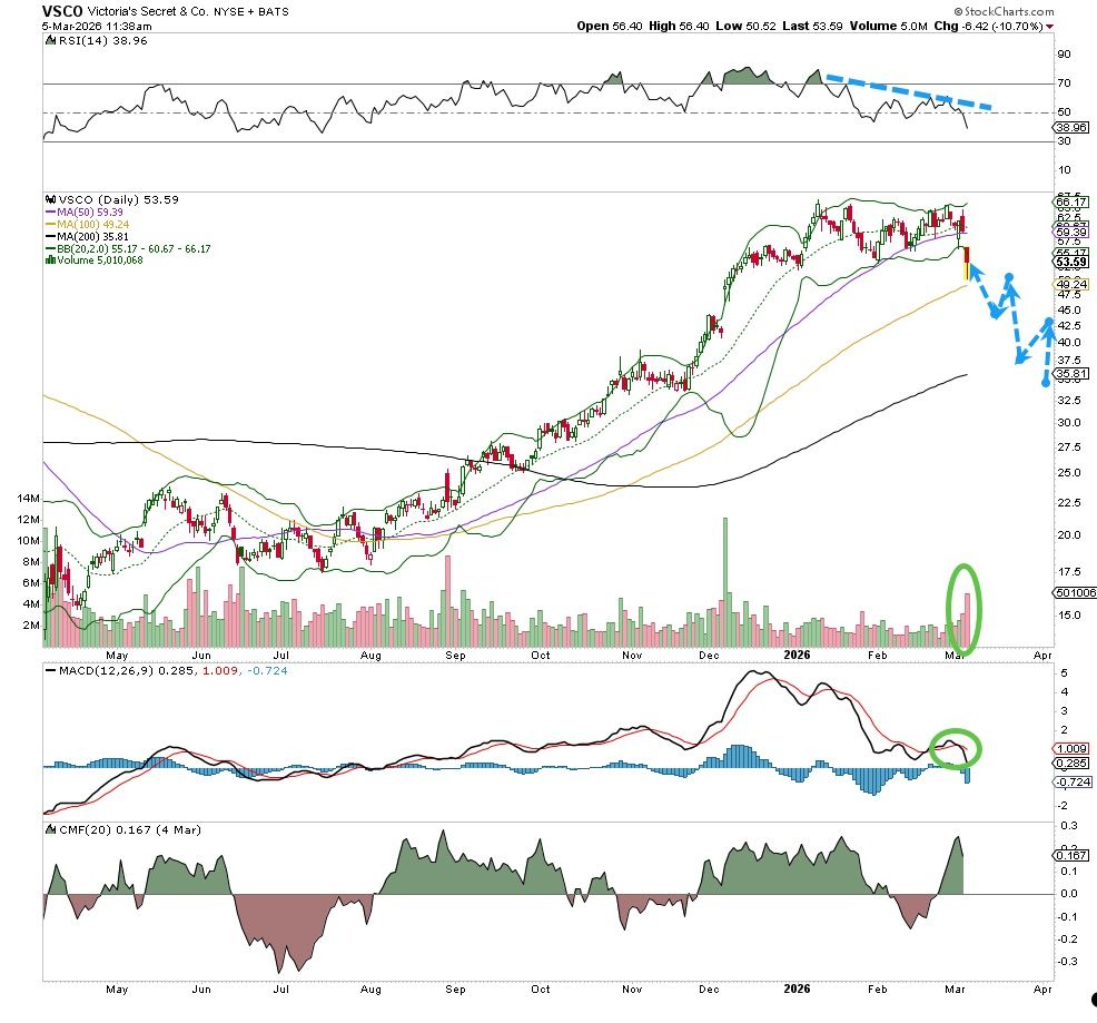 Not even strong earnings from Victoria's Secret (VSCO) could stop the sellers from blasting this stock this past week. Heavy volume trends turned bearish late in the week as investors responded to weaker than expected forward guidance from the company.