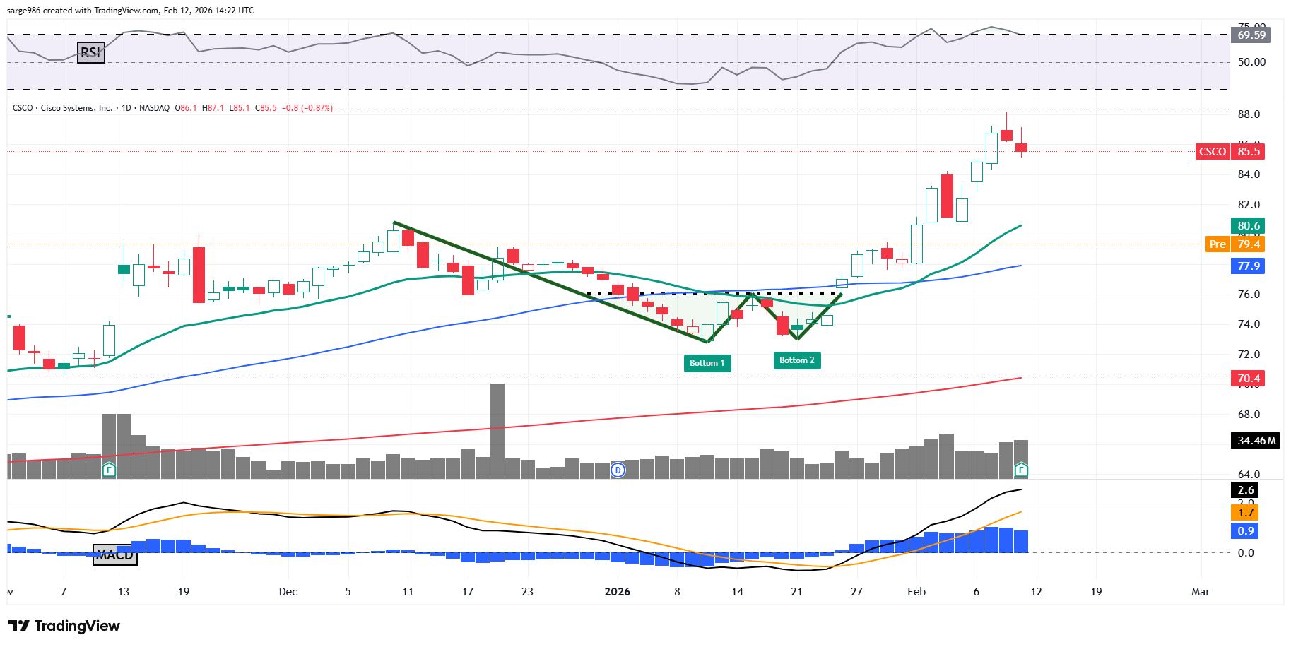 Readers will see that CSCO rocketed out of a double-bottom pattern of bullish reversal in early 2026, but that run looks to be finished. ​There will be a gap lower on the open, which could result in a test of the stock's 50-day SMA at $78. I believe that CSCO is probably a buy in between that 50-day SMA and the 200-day SMA at $70.