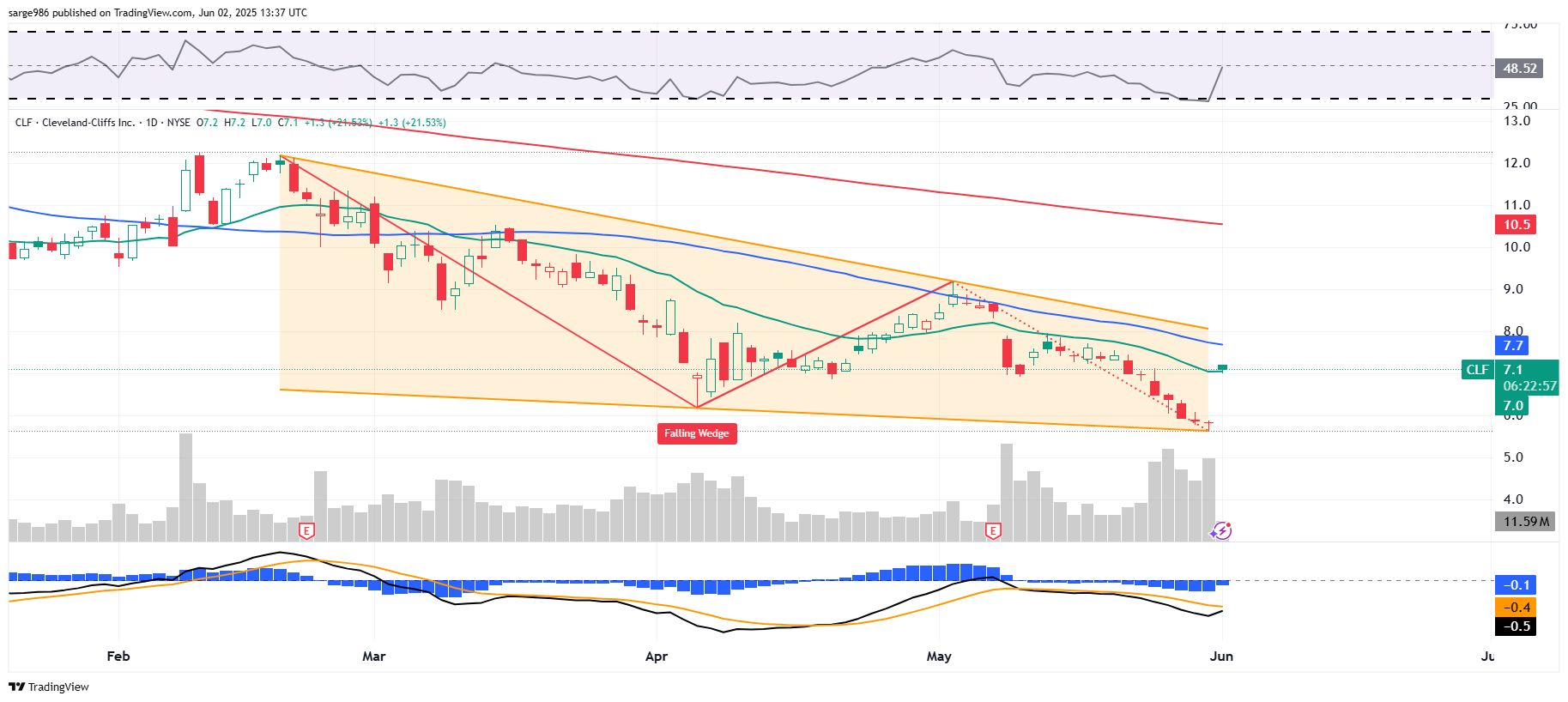 Since early April, CLF has developed what looks like a falling-wedge pattern, which is a pattern of bullish reversal. Just last Friday, the stock found support at the lower trendline for a second time. On Monday morning, CLF will threaten to retake its 21-day EMA at $7.10 and it's 50-day SMA at $7.70. One would bring the swing crowd on board. The other could persuade portfolio managers with an interest to increase long-side exposure.