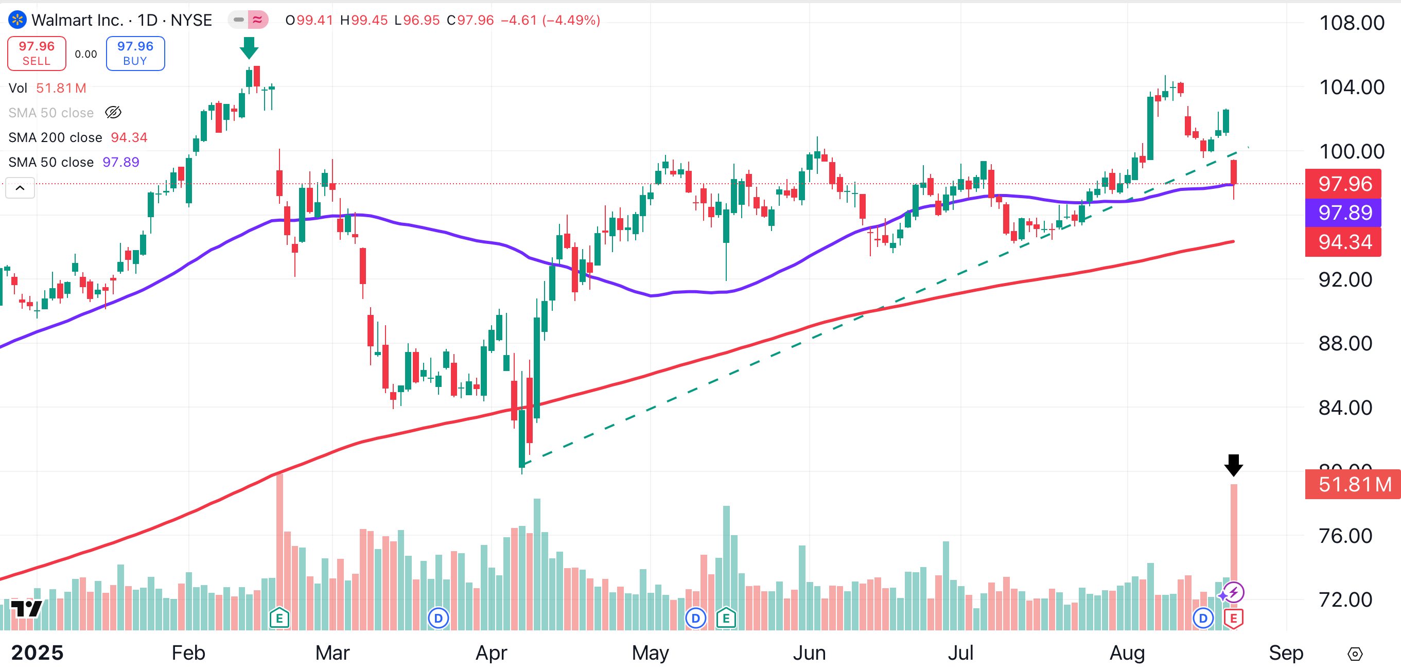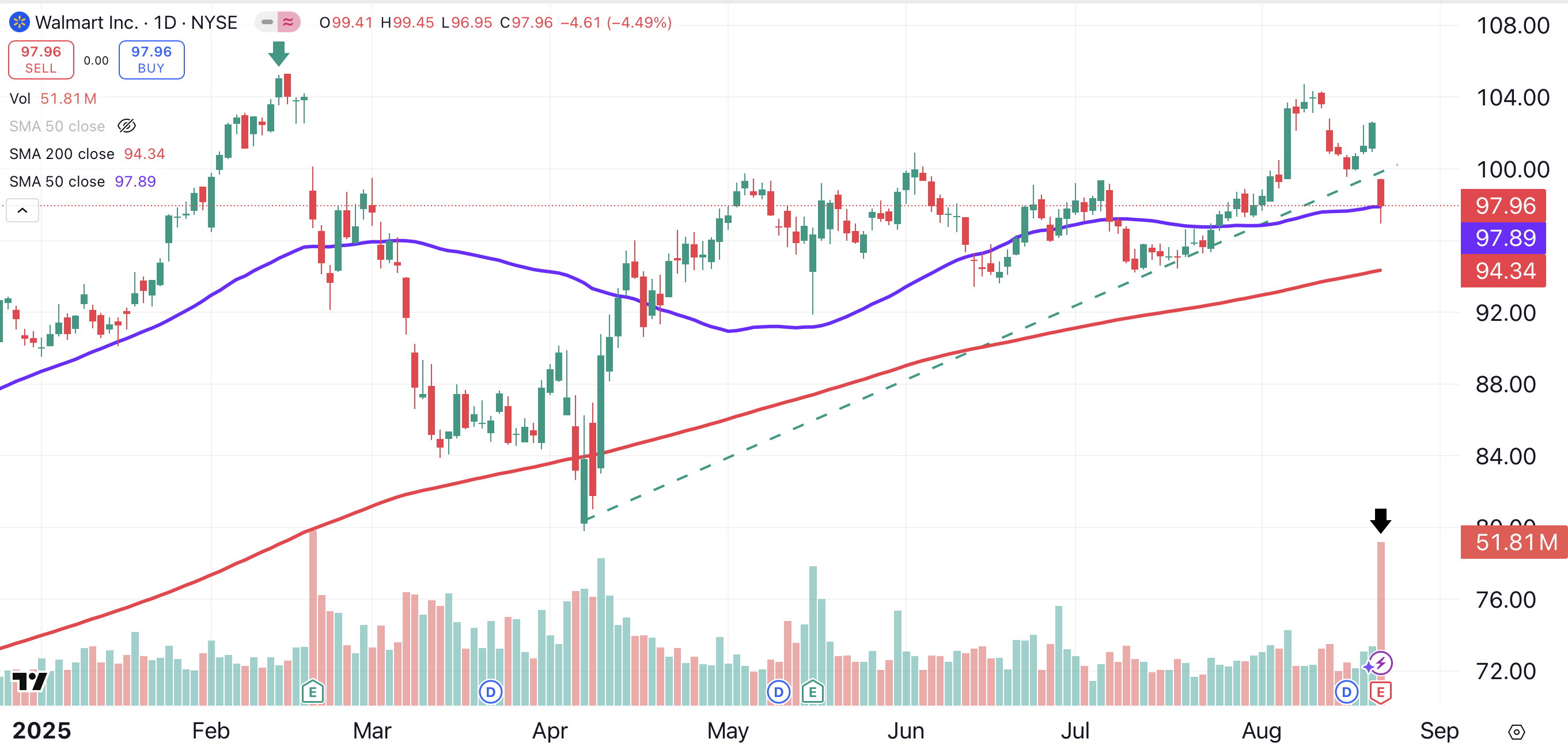Despite Walmart’s post-earnings gap to the downside, the stock remains above its 50-day moving average (blue). Walmart remains within shouting distance of its all-time closing high of $105, set in February (green arrow).