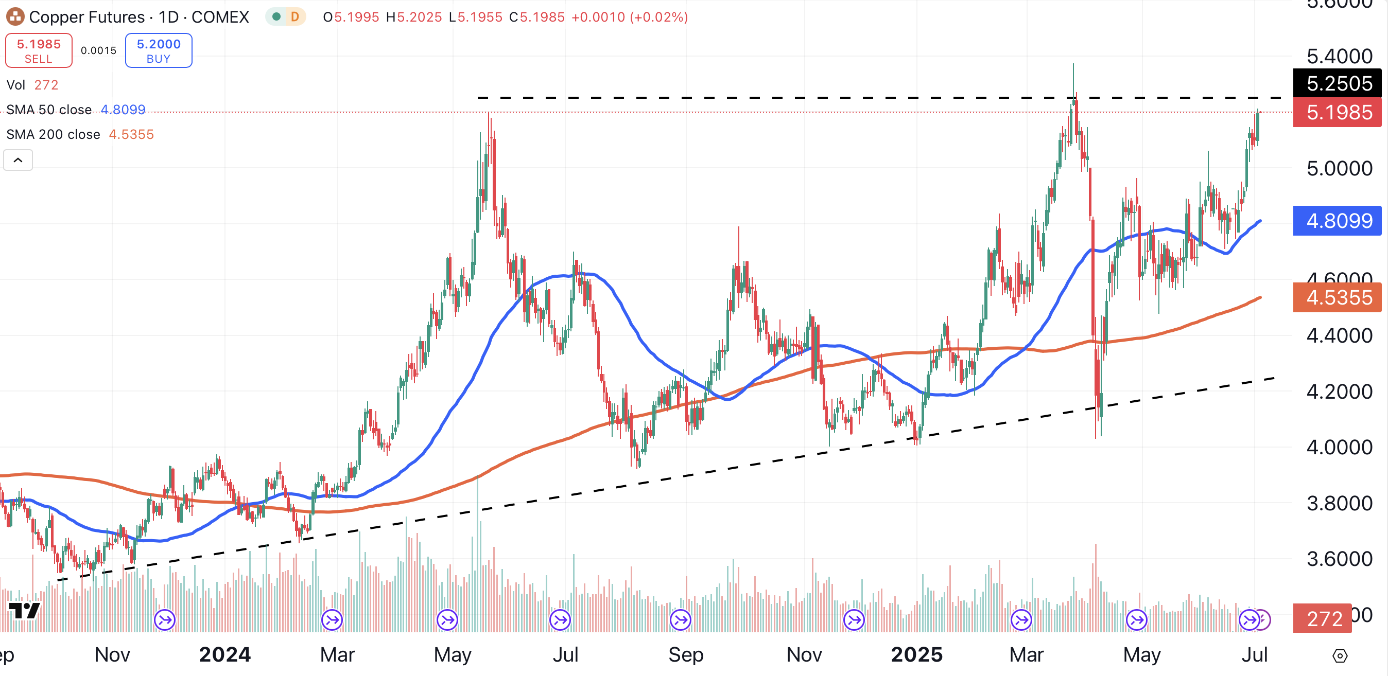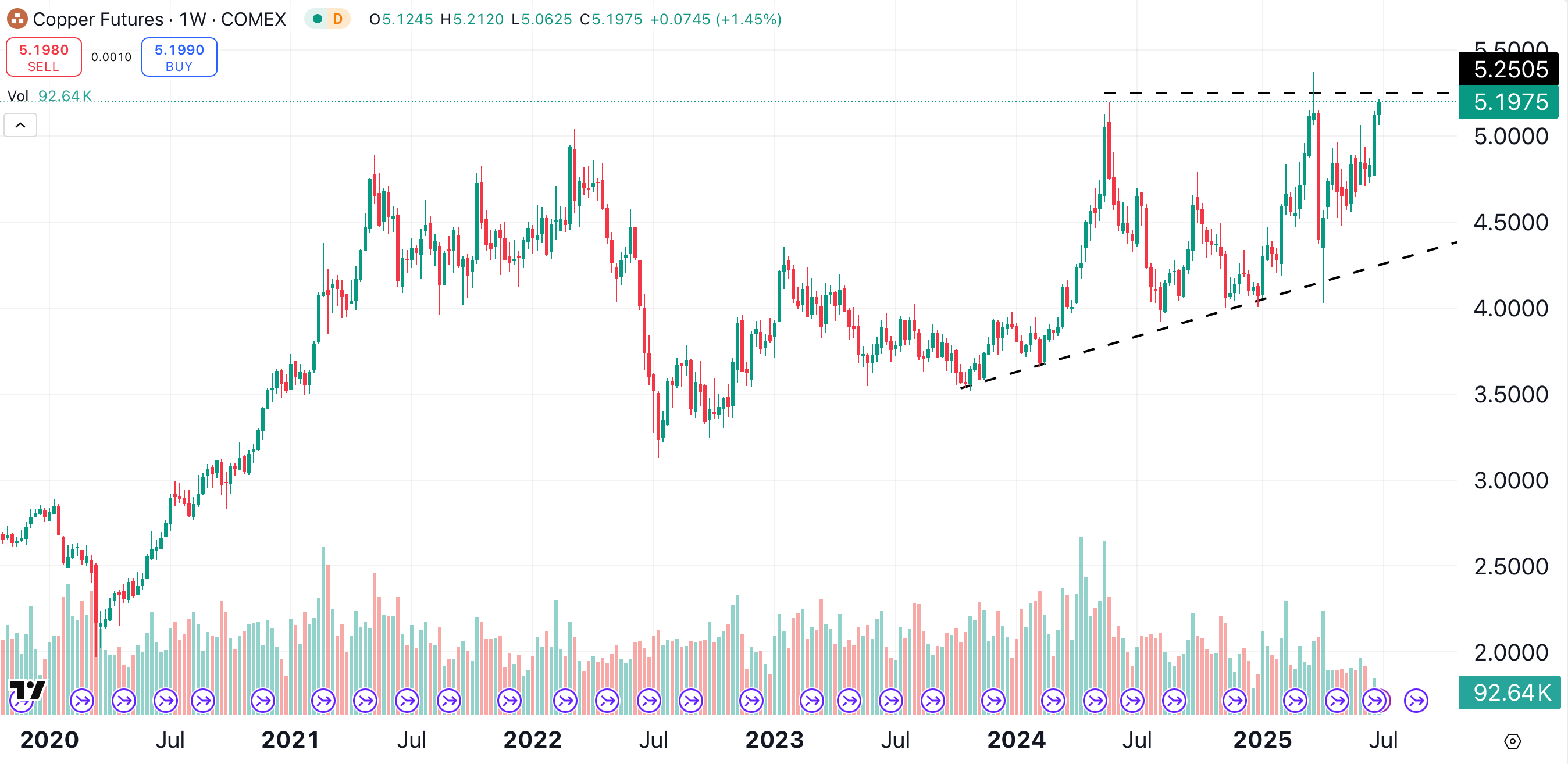 On its daily chart, the copper continuous contract is forming a huge ascending triangle pattern (black dotted lines). The pattern indicates that copper could eventually reach $6.00 per pound, which would mark a new all-time high.