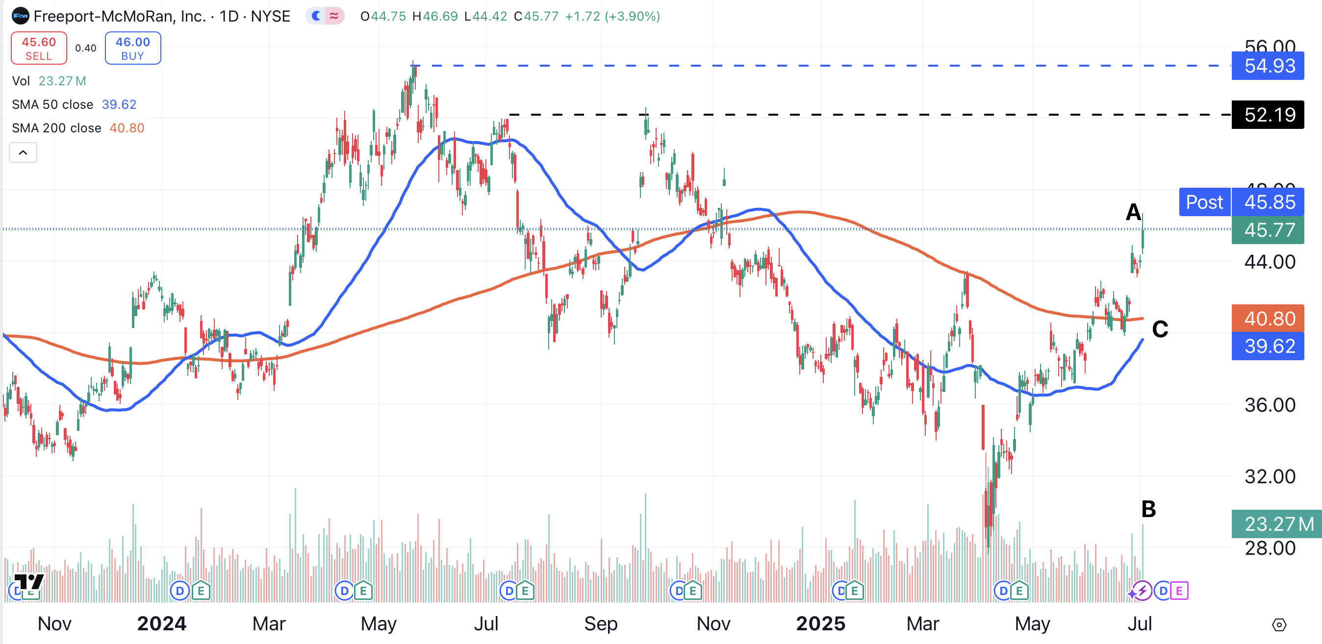The next resistance level beyond $52 is near $54 (blue dotted line). A break of that level would put the stock at multi-year highs.
