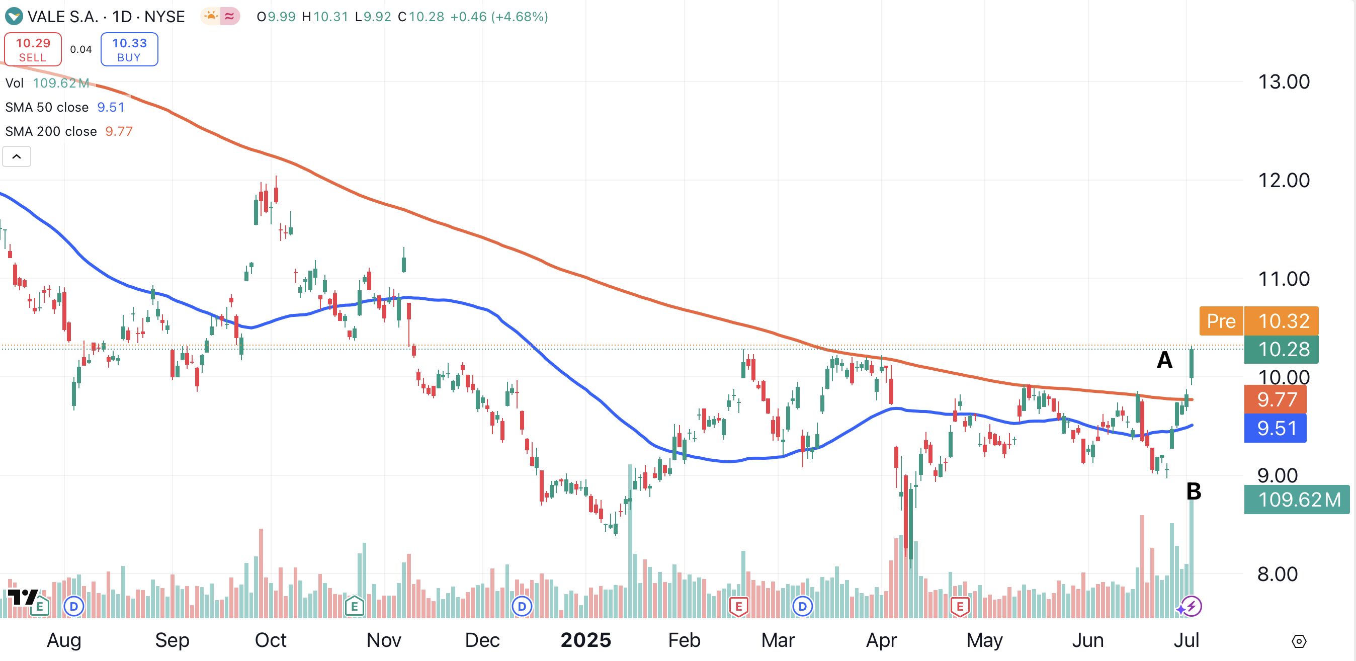Brazilian miner Vale VALE jumped 4.68% on Wednesday, causing the stock to break out to a new year-to-date closing high (point A). Like Freeport, Vale’s volume exploded, reaching its highest level since January (point B).