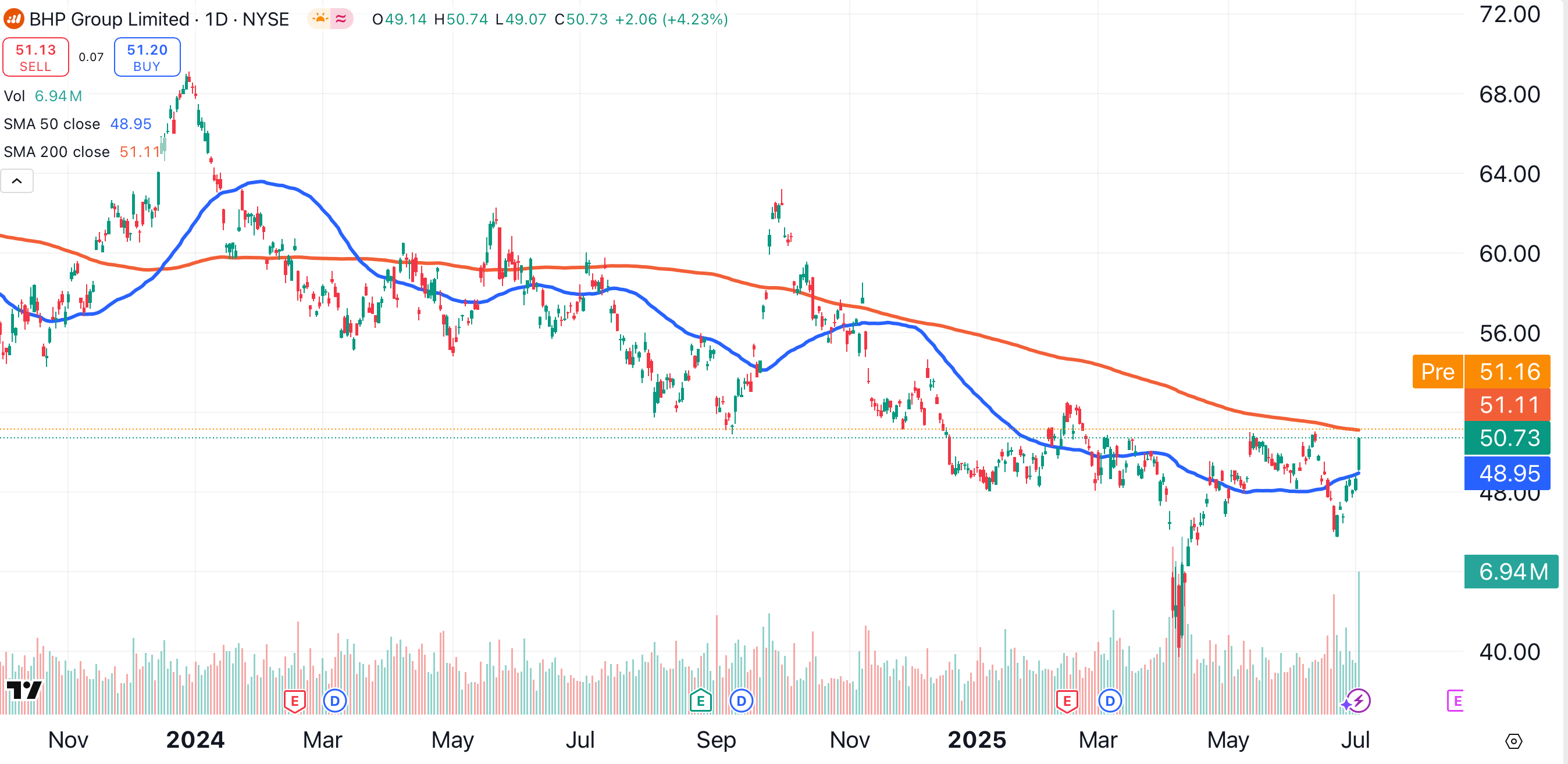 Despite the recent rally in copper, BHP is still mired in an 18-month long bear trend. BHP has traded below its 200-day moving average (red) since November of last year.