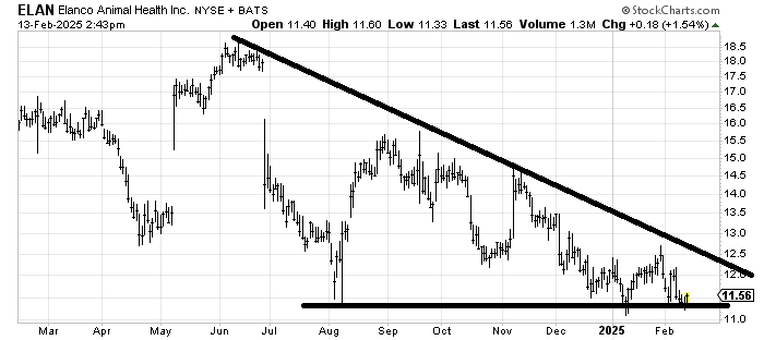 As someone who likes to find bottoms I am drawn to Elanco Animal Health ELAN, but it is grasping at straws to call it a bottom, especially in this market. A plunge under $11 and you’re wrong but I’m not sure it has the oomph to get over that downtrend line. Worth a try but I’d keep a short leash on it.